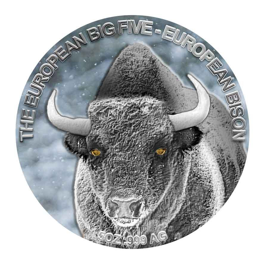 Don't miss this fantastic and feature packed silver coin that is a legal tender issue of Ghana. The European Bison is 5 ounces of .999 pure silver struck in ultra high relief and wrapped in select color, discreet gilding and antique finish.