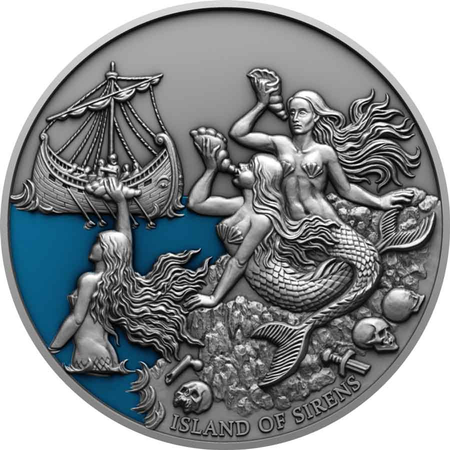 The Sirens is the 2nd issue in a coin series Mythical Creautes from Niue and the Lithuanian Mint that tells the story of four different elements of Greek Mythology, Labryinth of Minotaur, Siren Island, the Harpy Nest and the Kraken.