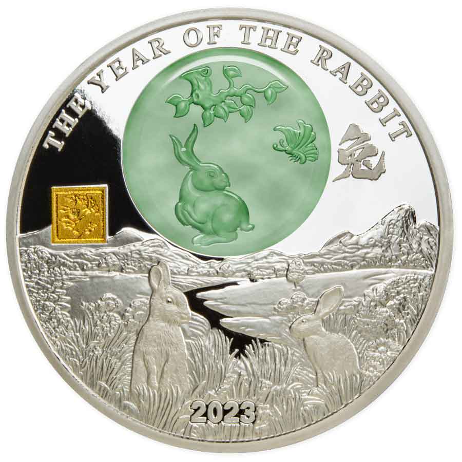 Struck from two ounces of pure silver, this legal tender issue of Burundi is sure to be a collectors favorite thanks to its realistic depiction of field rabbits at play. At 55 mm in diameter, the coin is large enough to highlight several key design points. First, on the reverse is the elaborately carved genuine jadestone inset alongside a 24K gold plated privy mark.