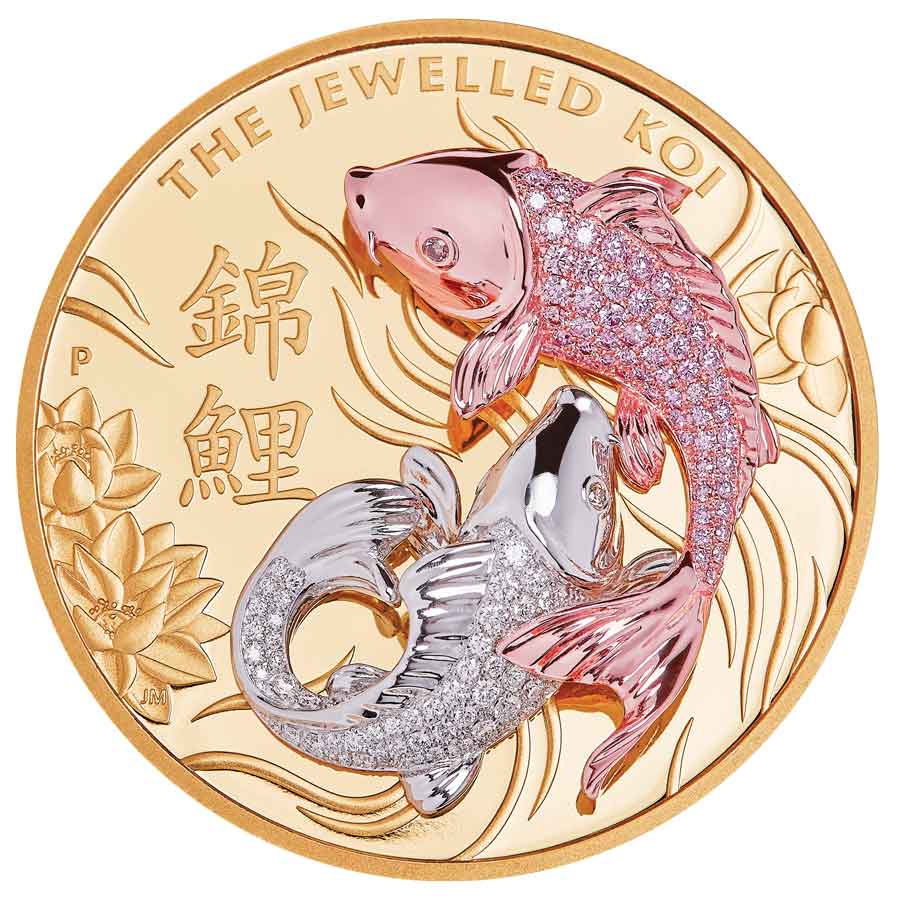 Struck from 10oz of 99.99% pure gold in proof quality, the coin is mounted with three-dimensional figures of two Japanese Koi. The 18-carat Rose Gold upper fish is pave-set with 78 pink diamonds from the Argyle mine, while the lower 18-carat White Gold fish is pave-set with 80 white diamonds.