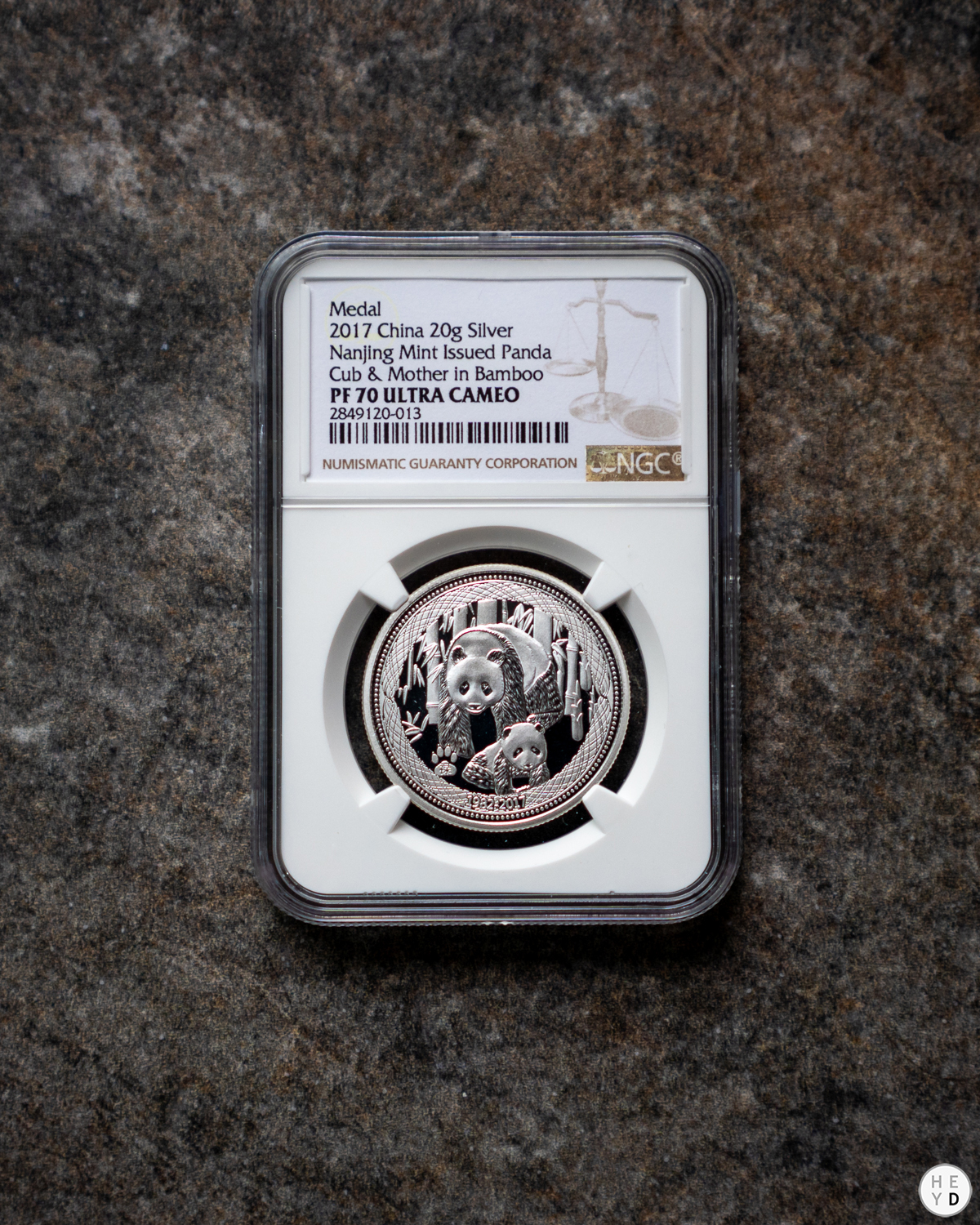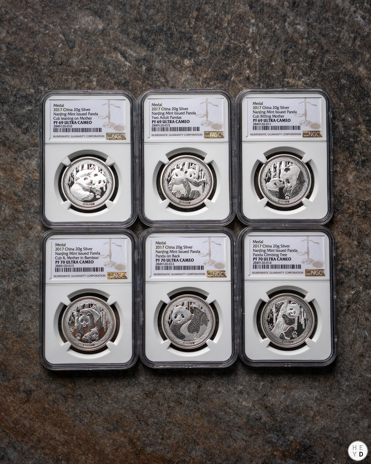 For the panda collector's consideration is this 6-medal proof set produced by the Nanjing Mint to celebrate 35 years of panda coins. Limited to 20,000 sets, this is number 10,587. Each medal is 20g .999 silver and has a different panda design. Three medals graded PF70 Ultra Cameo and three graded PF69 Ultra Cameo. This is the only set graded by NGC to date. Original display boxes and COA/paperwork will be included.